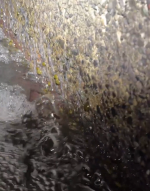 河川の人工構造の水流を泳げず必死に湿った壁面を這って「遡上」するシラスウナギ。幸運なことに地元の方にご案内頂いた。40年間で最大の数だと聞く。(以下略)