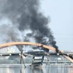 初期調査によると、橋の下を通る混載貨物車が橋桁に接触し、車両が発火して火災が発生。