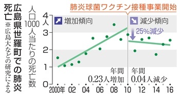 広島大の研究チームは、広島県の山間地域の住民を対象にした接種事業で、肺炎の死亡率が大幅に減少したことを実証した。