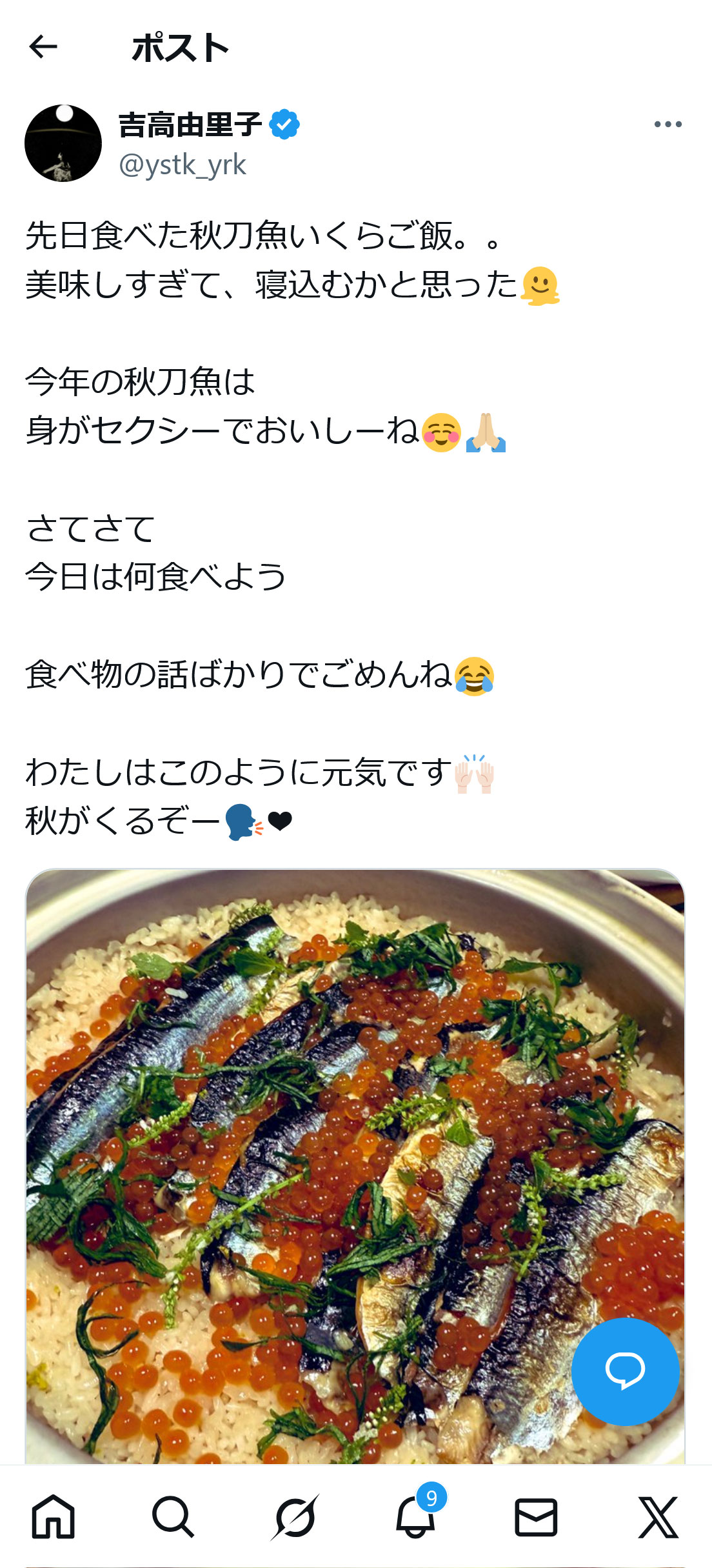 そして「今年の秋刀魚は身がセクシーでおいしーね さてさて今日は何食べよう 食べ物の話ばかりでごめんね」とつづり、「わたしはこのように元気です 秋がくるぞー」と続けた。