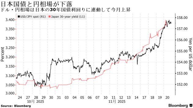 日本政府が21日に閣議決定する経済対策の膨張が財政悪化につながるとの懸念が広がり、10年国債利回りは2008年6月以来約17年半ぶりの高水準に上昇した。円相場も1ドル=157円台後半と1月中旬以来の安値を付け、日銀が介入に動く可能性のあるゾーンに接近した。