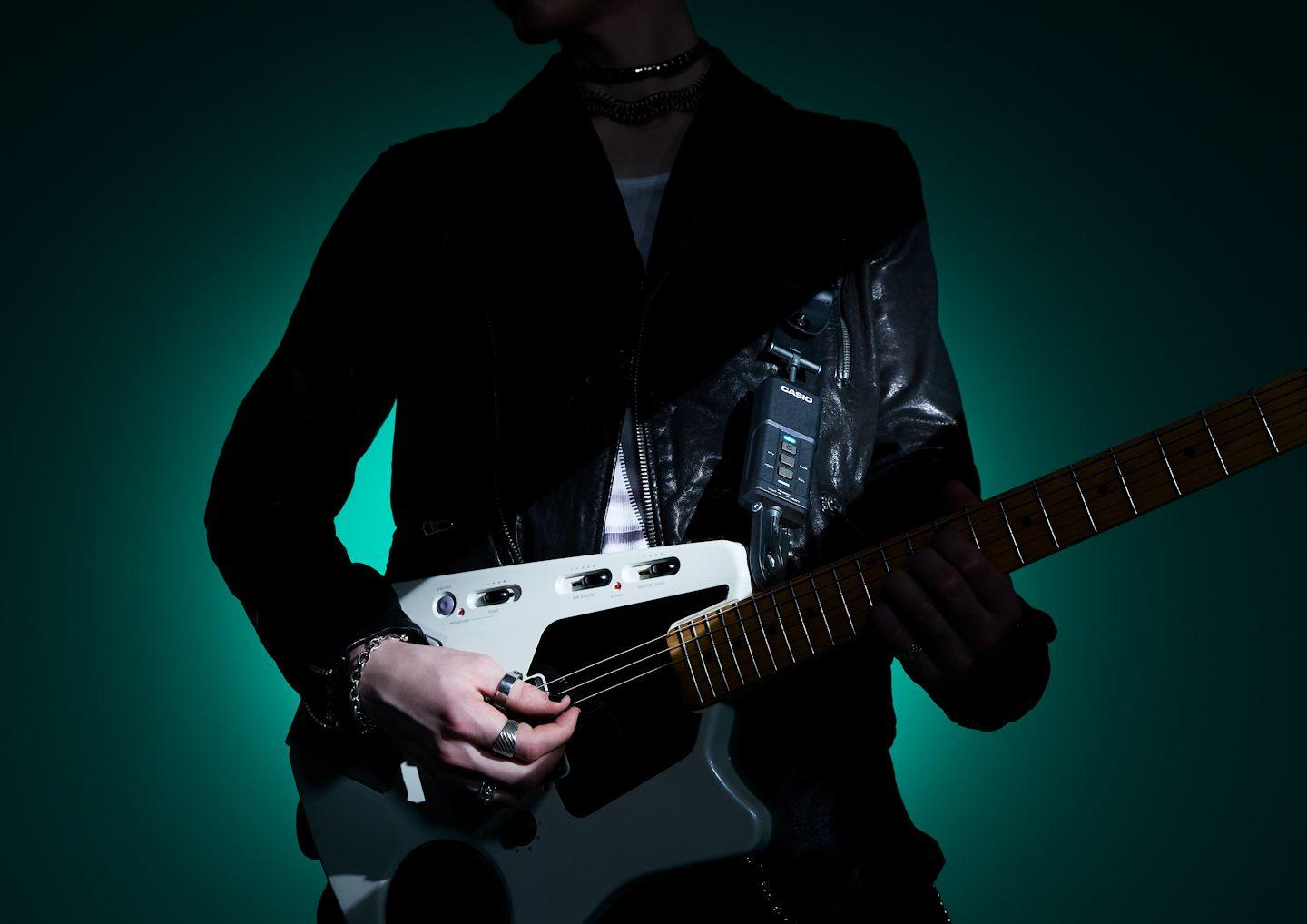 CASIO(カシオ)が発表した「DIMENSION SHIFTER(ディメンションシフター)」は、ギターストラップに装着して手で操作するエフェクトコントローラー。トランスミッター、レシーバー、ギターに傷が付くのを防ぐトランスミッター用のシリコンカバーのセットになっています。